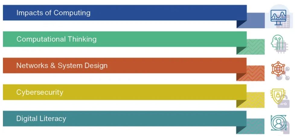 The standards focus on more than just learning to code. They are organized into five key areas: Impacts of Computing, Computational Thinking, Networks and Systems Design, Cybersecurity, and Digital Literacy. Together, these areas help students learn how computers work, how to solve problems with technology, how to use digital tools responsibly, and how technology affects individuals and society. Learning expectations are presented by grade bands, allowing students to build understanding over time in developmentally appropriate ways.