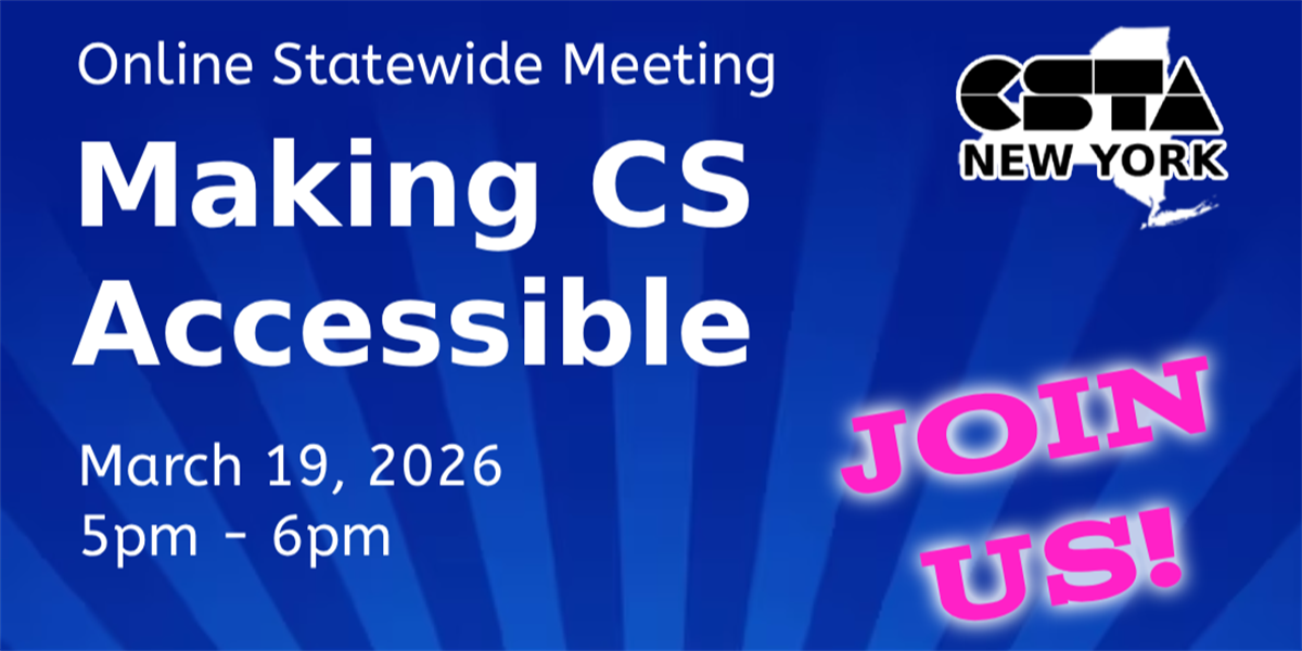 Participation is free for both CSTA New York members and non-members. Use the simple event registration here to sign up. The link to join will be sent to the email address you register with.